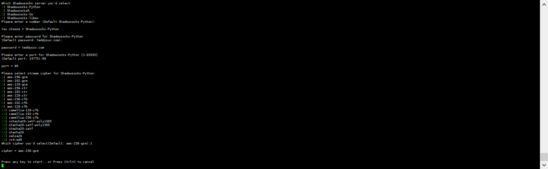 ./shadowsocks-all.sh 2>&1 | tee shadowsocks-all.log,按提示选择服务器部署选项(如选第1个),设置密码、加密方式等,记住服务器IP、端口、密码和加密方式等信息。