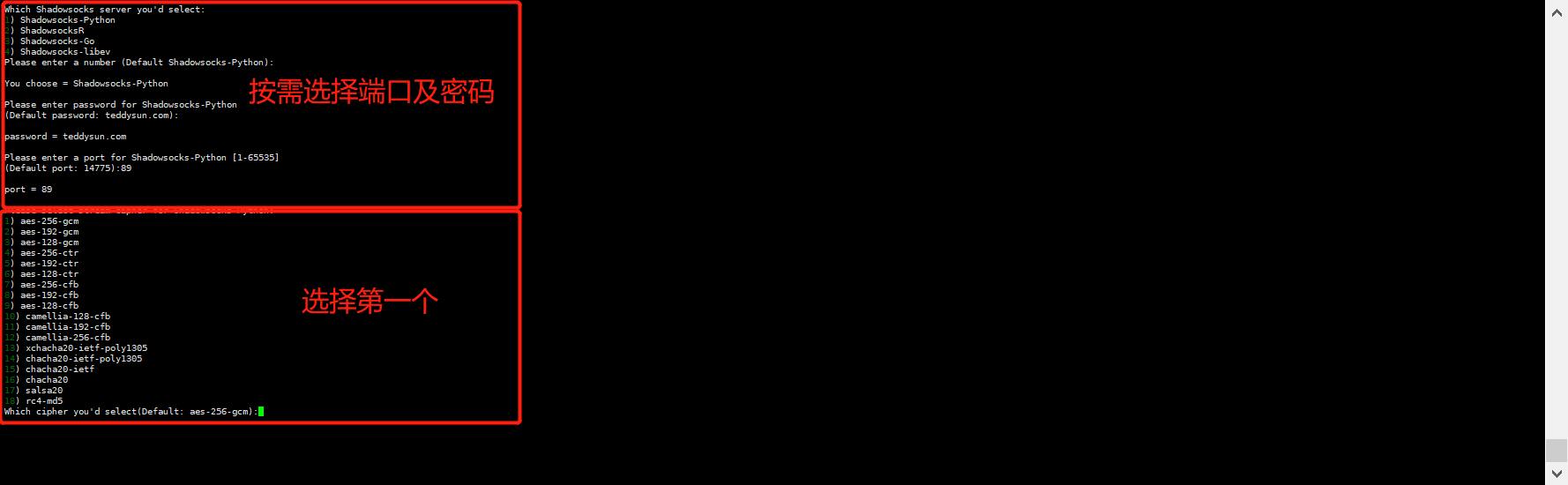 ./shadowsocks-all.sh 2>&1 | tee shadowsocks-all.log,按提示选择服务器部署选项(如选第1个),设置密码、加密方式等,记住服务器IP、端口、密码和加密方式等信息。